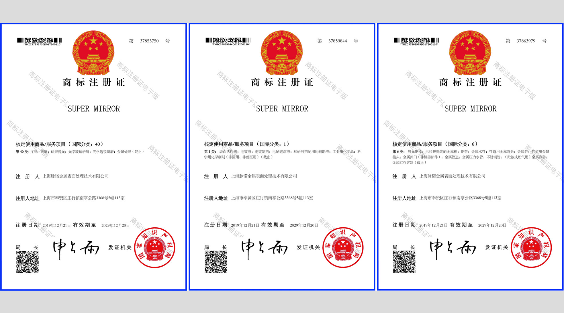 上海脈諾金屬表面處理技術(shù)有限公司:完成SUPER MIRROR(超鏡面)商標(biāo)注冊工作。