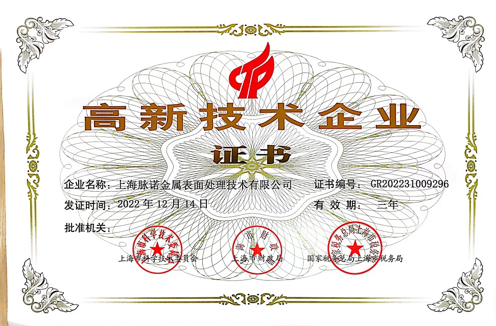 近日,上海脈諾金屬表面處理技術(shù)有限公司(上海脈諾)收到由上海市科學(xué)技術(shù)委員會、上海市財政局、國家稅務(wù)總局上海市稅務(wù)局聯(lián)合頒發(fā)的《高新技術(shù)企業(yè)證書》,發(fā)證時間為2022年12月14日,有效期三年。