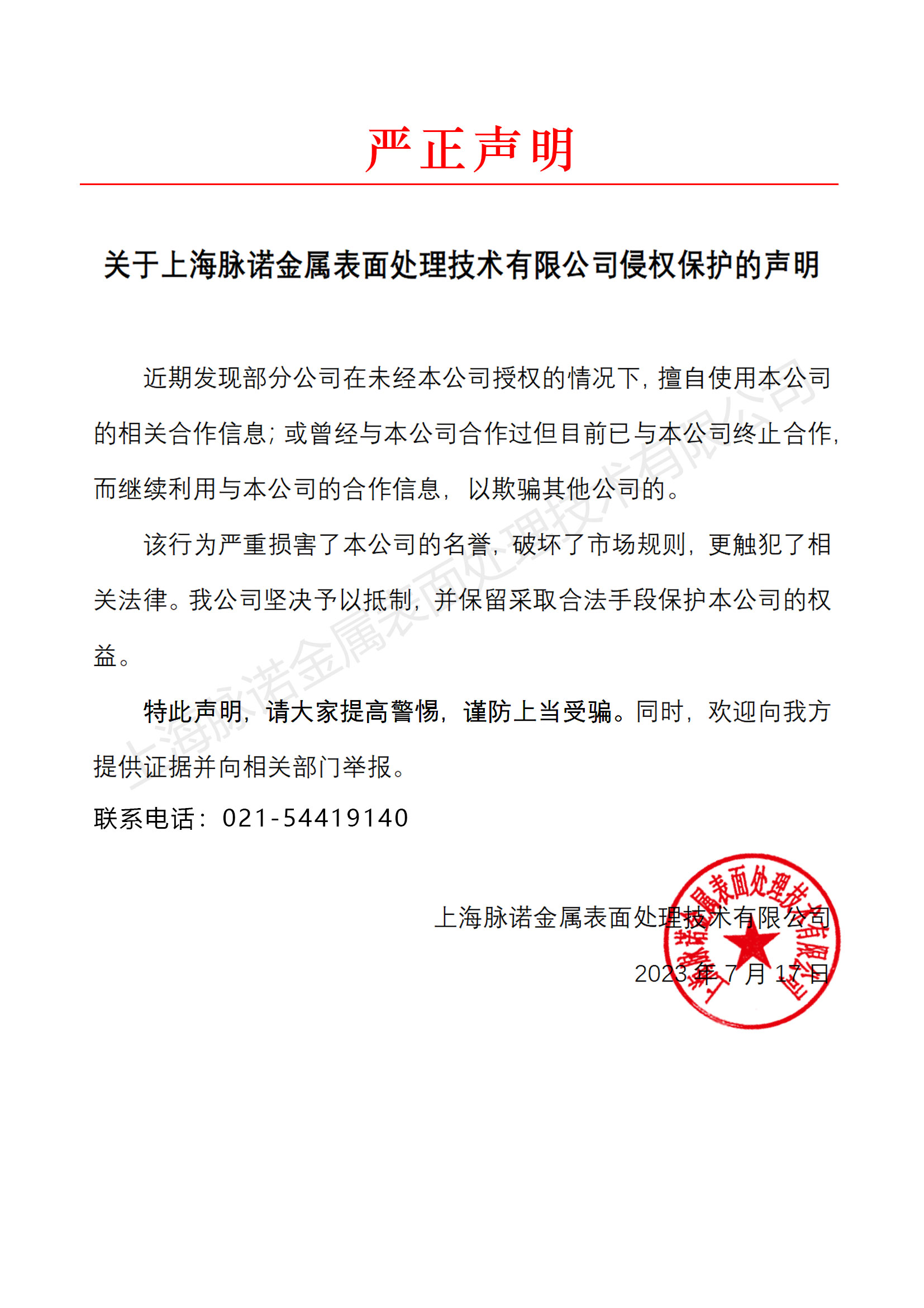 關(guān)于上海脈諾金屬表面處理技術(shù)有限公司侵權(quán)保護(hù)的聲明